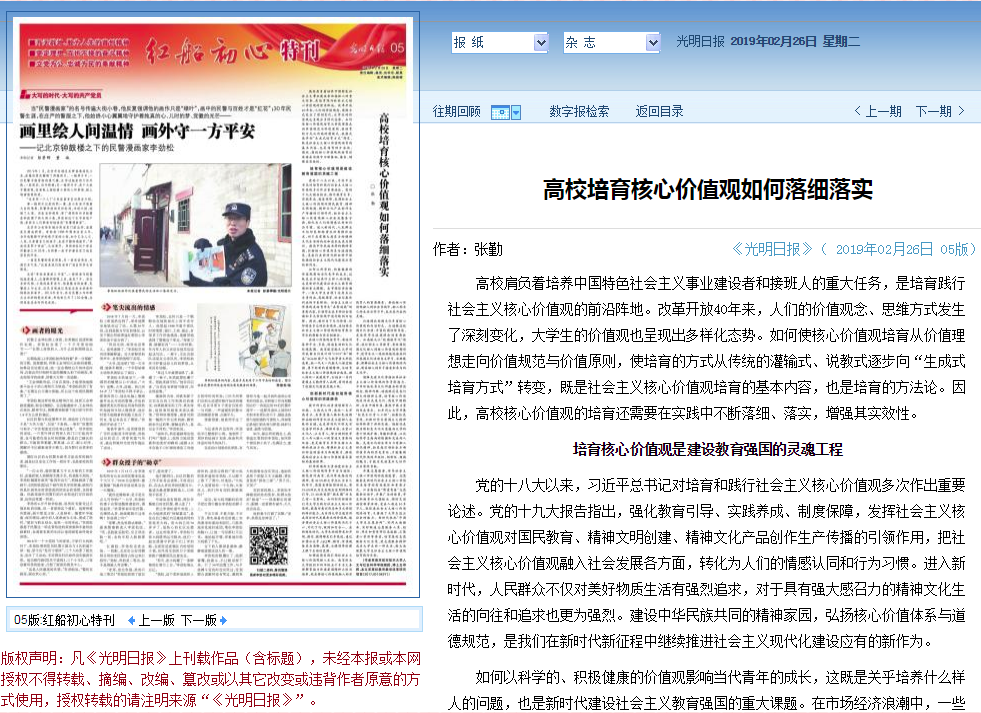 2019年2月26日,《光明日报》红船初心特刊发表国产成人 张勤教授的理论文章《高校培育核心价值观如何落细落实》。