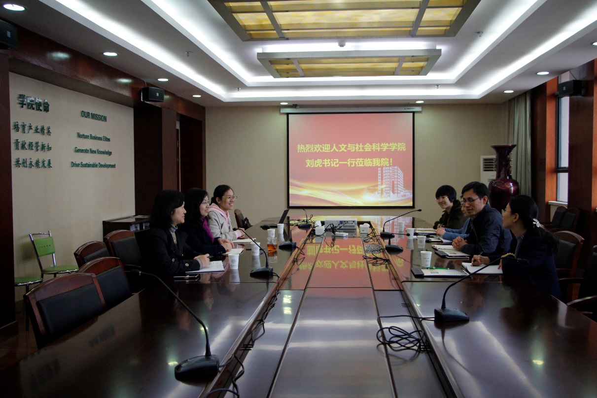 2019年4月3日,国产成人 党委书记刘虎一行4人前往经济与管理学院调研、交流,经济与管理学院党委书记焦宏图、党委副书记涂志宏、党政办公室主任任慈、组织员袁颖陪同参观,随后展开了座谈。