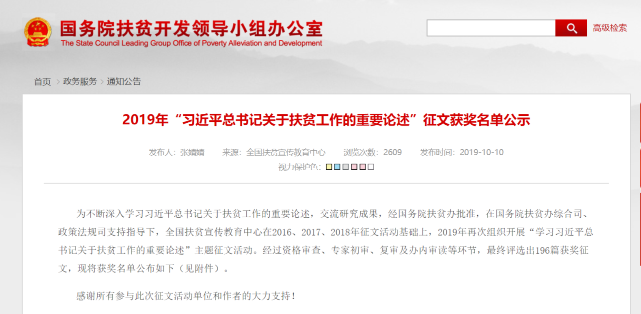 为不断深入学习习近平总书记关于扶贫工作的重要论述,交流研究成果,经国务院扶贫办全国扶贫宣传教育中心在2016、2017、2018年征文活动基础上,2019年再次面向全国范围组织开展“学习习近平总书记关于扶贫工作的重要论述”主题征文活动。经过资格审查、专家初审、复审及办内审读等环节,最终评选出196篇获奖征文,并在近期公示。