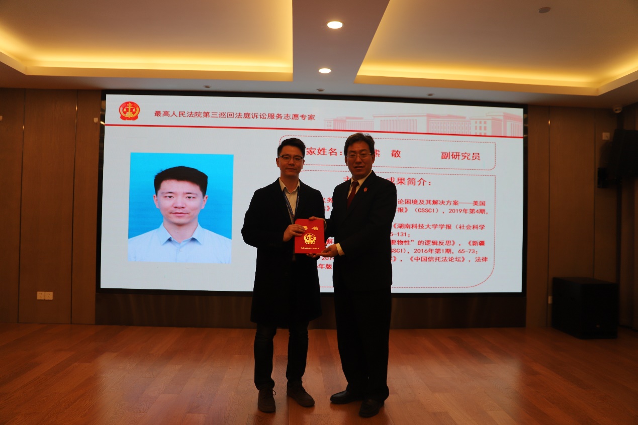仪式中,最高人民法院第三巡回法庭分党组副书记、副庭长李成玉为南京大学心理健康教育中心主任费俊峰教授、东南大学法学院于立深教授等20名诉讼服务志愿专家颁发了聘任证书。诉讼服务志愿专家围绕矛盾解决纠纷机制中如何发挥中立第三方作用、如何增强社会对法院工作的理解和认同、如何从源头上解决纠纷、诉讼服务志愿者的工作方式和注意事项等问题展开了交流讨论。