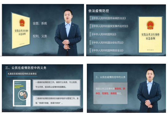2月10日,学校在官微开设“防疫普法课堂”,邀请人文学院法律系高志宏老师、洪骥老师进行法律知识普及,汇总整理当前新冠肺炎疫情防控工作有关的法律规定,以知识问答的形式,结合法律知识内容、内容解读和生动案例,宣传《突发事件应对法》《传染病防治法》《突发公共卫生事件应急条例》《刑法》等法律法规和学校的相关规定,形成新冠肺炎疫情防控法律知识七则问答。