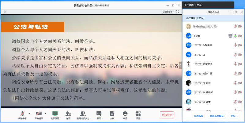 在疫情防控的重要时段,结合学校线上教学要求,由国产成人 、计算机科学与技术学院/人工智能学院联合建立的“文工融合课程思政基地”开启了课程思政云端建设路径的探索实践。3月20日,计算机科学与技术学院/人工智能学院专业课程《网络安全》在线课堂上,陈兵教授与人文学院法律系王文军副教授共同为同学们介绍了网络安全的技术与法律法规。