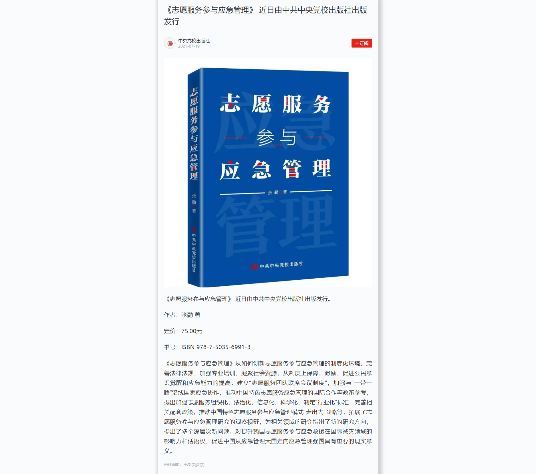 近日,国产成人 张勤教授新书《志愿服务参与应急管理》 由中共中央党校出版社出版发行,并被“学习强国”平台推荐。