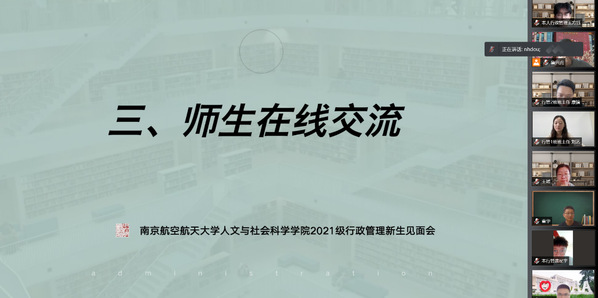 9月18日上午10时20分,国产成人 人文与社会科学院法律系、行政管理系2021级新生专业见面会在腾讯会议网络平台分别召开。两专业系主任、专业负责人、新生班主任以及教师代表参加了本次会议,会上老师们就各专业学生培养、未来发展等方面进行了专业细致的解读。