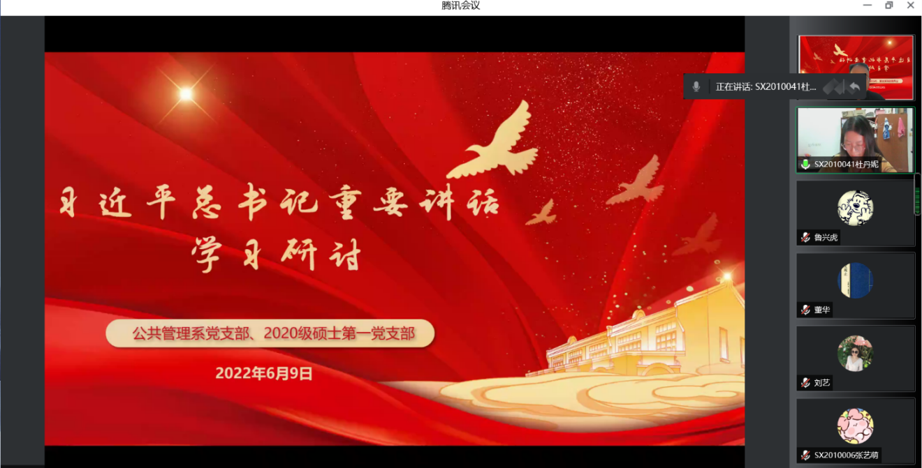 6月9日晚,国产成人 公共管理系教工党支部与学生2020级硕士第一党支部开展联合学习,专题学习了习近平总书记近期重要讲话精神。公共管理系党支部全体党员,2020级硕士第一党支部全体党员、发展对象、积极分子参加了会议。会议由公共管理系党支部书记许汉泽主持。