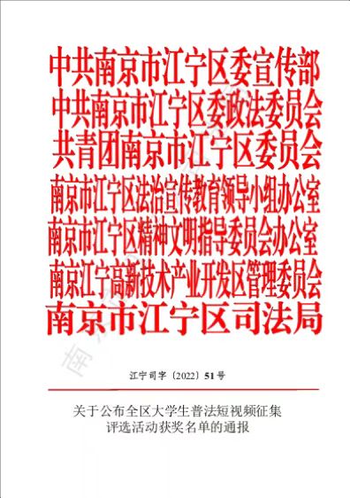 近日,江宁区大学生普法短视频征集评选活动圆满结束,我校积极组织学生参与,荣获组织奖。