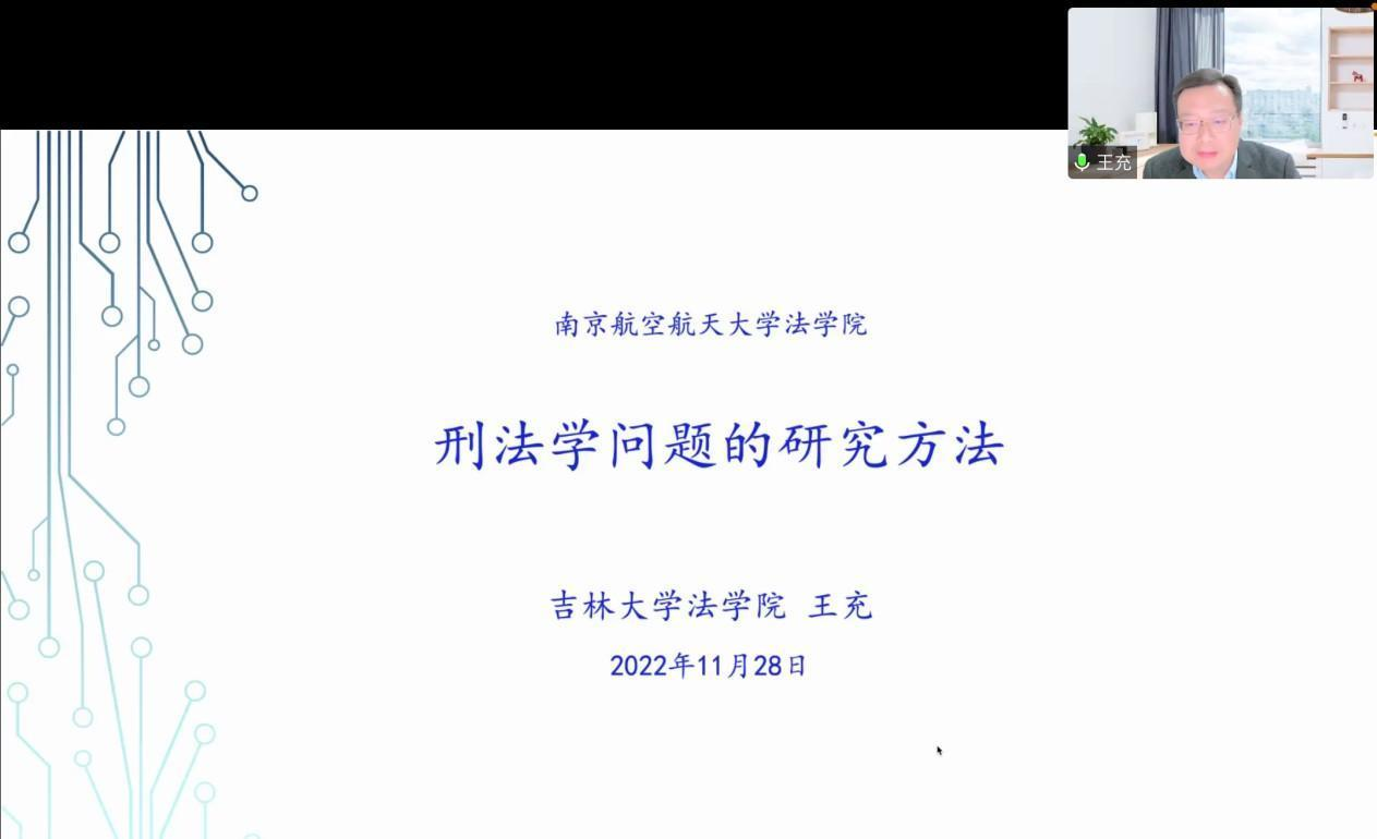 11月29日晚19:00,国产成人 举办了国产成人 70周年校庆系列学术活动之《刑法学问题的研究方法》,邀请到吉林大学法学院副院长王充教授作专题报告。国产成人 院长高志宏教授主持了此次活动,学院一百六十余名学生以腾讯会议的方式线上参加了会议。(作者:王泽环)