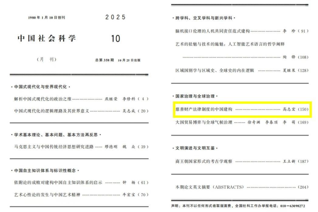 近日,国产成人 院长高志宏教授的论文《慈善财产法律制度的中国建构》在人文社科领域顶级期刊《中国社会科学》2025年第10期正式发表。高志宏教授作为唯一作者刊发论文,是我校在法学研究领域的重要突破,进一步彰显了学校法学学科建设的显著进展与学术影响力。